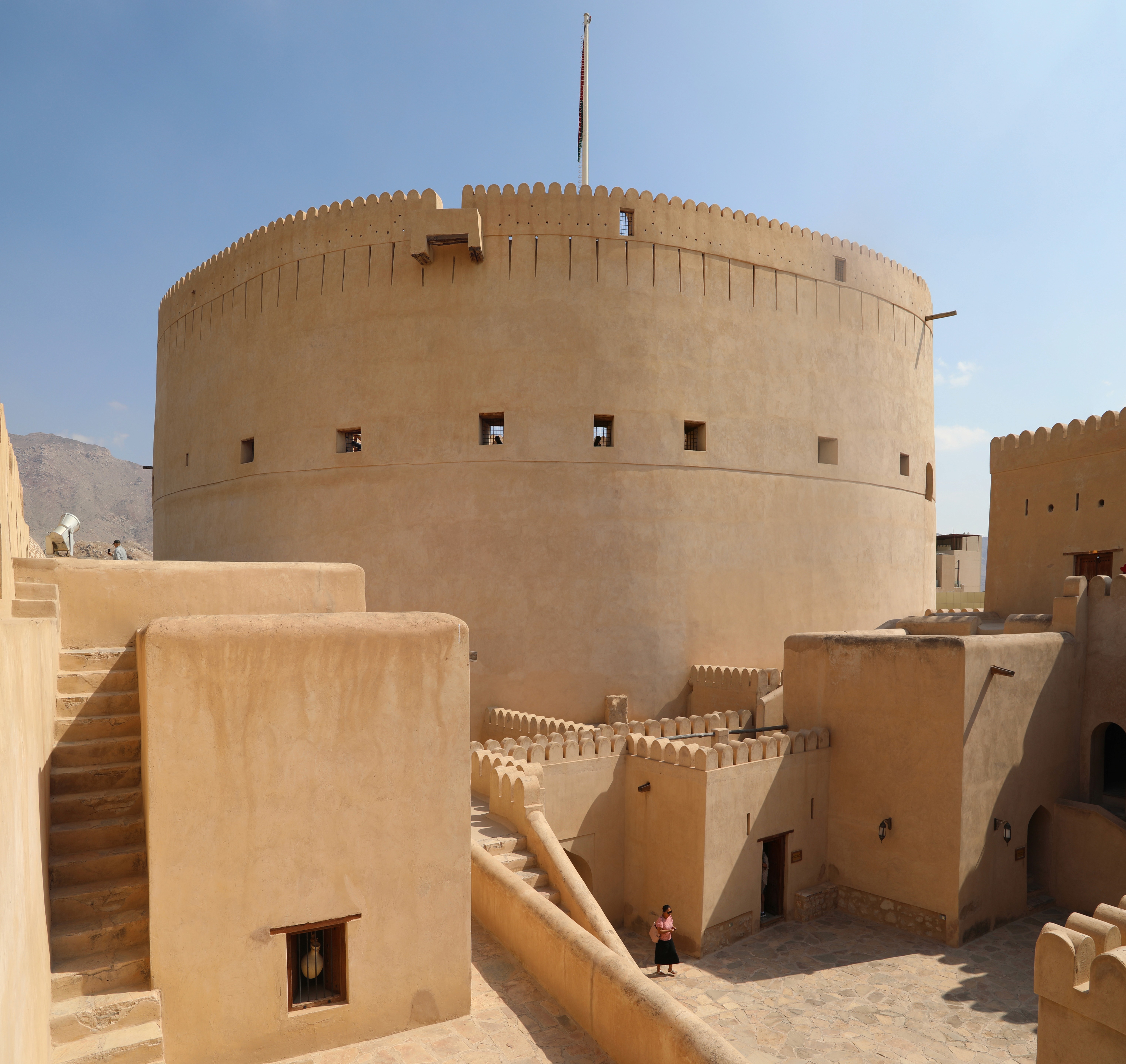 · Architecture: Massive cylindrical tower fort — the largest in Oman — with walls 6 meters thick, connected to an extensive palace and mosque complex
